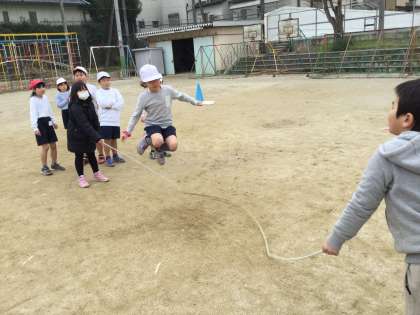 大繩を使って,八の字とびなどもしています。入るタイミングが難しいみたいですが,声を掛け合いながらタイミングをあわせていました。
