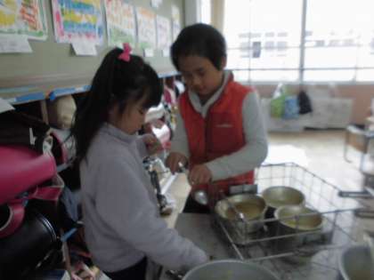 給食の片づけをしている時,「スプーンの向きがちがってるから。」と,気が付いた子どもたちがさっと直してくれていました。気付いたらすぐに行動に移せるなんて素敵なことですね。