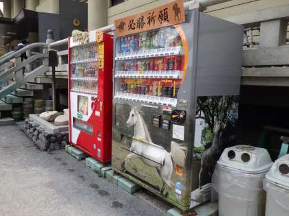 子どもたちに噂の自動販売機を発見!商品が出てくるときに「ヒヒ〜ン」と馬の鳴き声が聞こえるそうです。