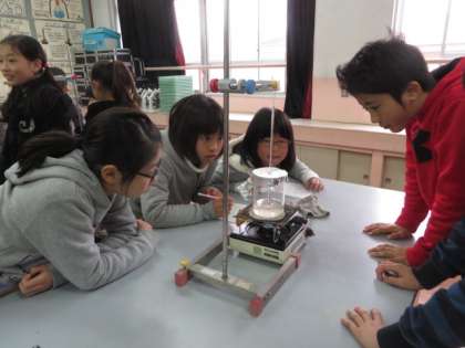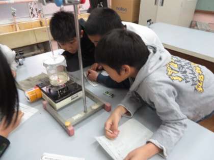 13分ほどの実験ですが,火を使うので緊張感があります。「泡が出てきた」「沸騰してる!」と観察もしっかりできていました。これからのまとめも頑張ってくれることでしょう。
