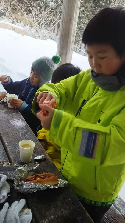 冷たい雪の中,あったかいパックドックをおいしくいただきました。