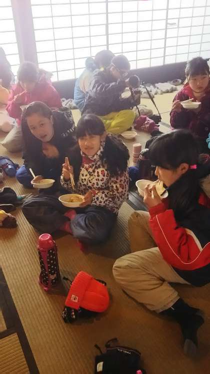 楽しくもちつきをして,食べています。