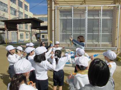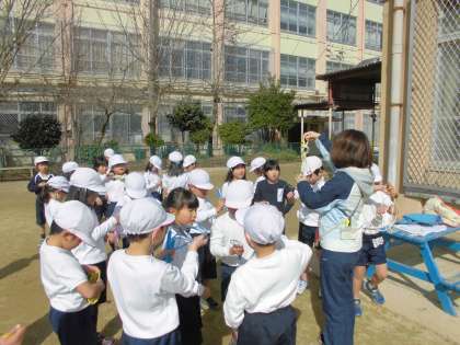 縄跳びをした後は,縄の片づけ方も確認しました。先生のお手本を見ながら,縄を「くるり」と結ぶ練習をしました。