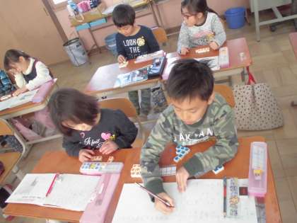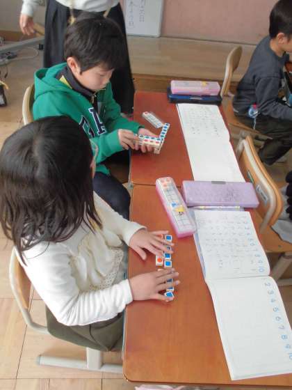 どちらが多いか,少ないかを数図ブロックを使って考えました。数図ブロックを使うのもこの一年間でとても上手になりました。ブロックを使って考えた後は,図をかき,分かったことを図にかきこむこともできるようになりました。