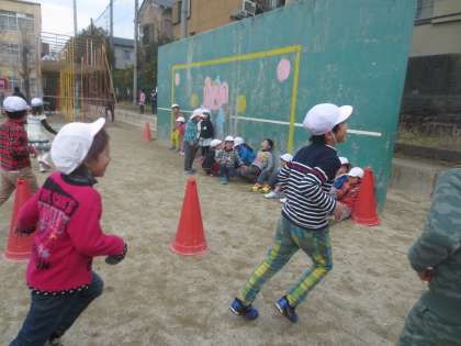 緑ゼッケンのお姉さんとお兄さんが警察役,1年生全員泥棒役!