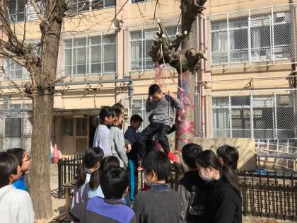 太い幹を生かして、ブランコをつくりました。ロープを頑丈にするために、いろんなロープのかけ方を確かめました。奥にかけ過ぎるとうまくこげなくて、少し前にかけると、うまくこげました。楽しくなるように、カラフルにしました。