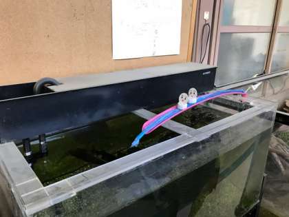 くつべらを見ていると、ウォータースライダーに見えてきました。このスライダーを水そうの上に置いて、落ちそうな雰囲気を表現しました。