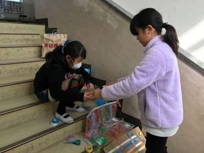 階段の形を生かして、すべり台をつくりました。カラフルにして、できるだけ楽しく見えるようにしました。同じ場所でも、付け足すだけで全くちがう場所のようになりました。家の中や近所でもやってみたいと思います。