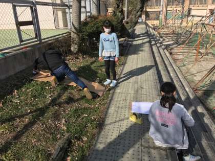 すべり台を段ボールでつくりました。坂になる場所を選びました。ビニールテープをつけて、よくすべるようにしました。