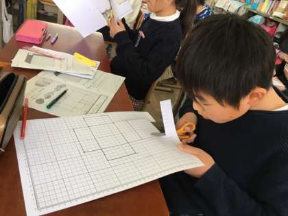 この時間は,箱を切り崩したときの図「展開図」を作っています。
