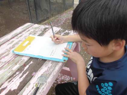 「この花の中には,黄色のダイヤの形をしたものがある!」「だんごむしの足って,こんなにたくさんあるんだね!だから動くのがはやいのかな?」など,虫眼鏡を使ってじっくり見たことで,初めて知る発見もあったようです。観察カードにも気付いたことや驚いたことをしっかりまとめることができました。