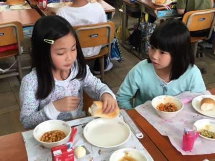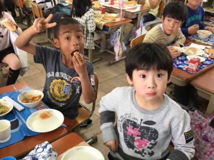給食を食べる量が少し増えてきたのでしょうか?とても楽しく、とてもおいしそうに給食の時間を過ごしています。