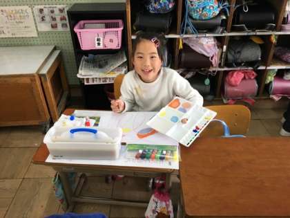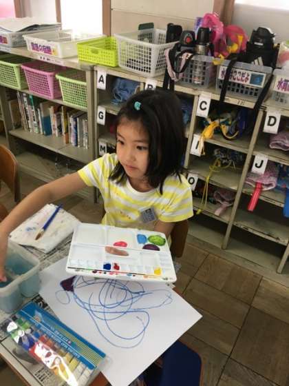 絵具を使って作品作りに挑戦しました。先日は色を混ぜるとどのような色になるのかを確かめましたが、今回は・・・。素敵な色、できたかな?