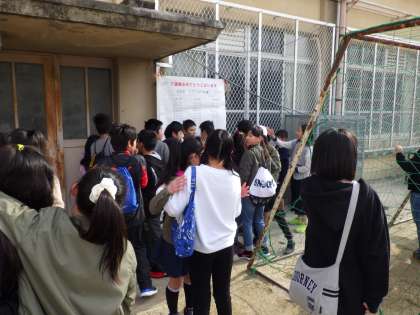 4月10日,新年度がスタートしました。運動場に掲示してあるクラス分け名簿で新しいクラスと友達を確認しています。歓声が沸き起こっています。