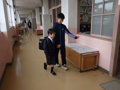 藤ノ森小学校のお兄さん,お姉さんとして,1年生を教室まで案内しています。最高学年として第一歩を踏み出しました。