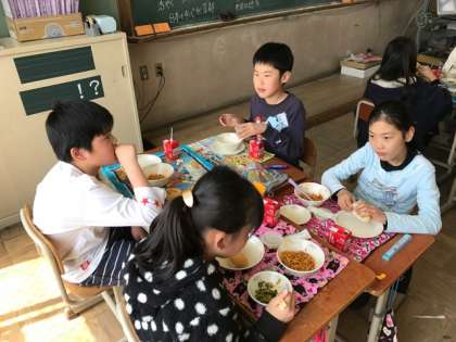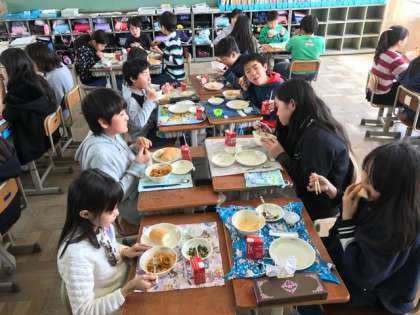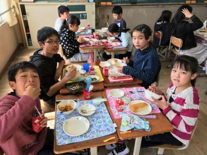 笑顔があふれますね。好き嫌いはありますが、とってもおいしそうに食べてます。そして、お友達との会話が楽しいみたいです。