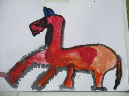 力強い感じを赤で表現しました。足を前に向けて描くことで,今にも走りだしそうな様子を表しました。