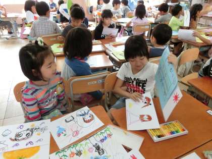 自分が描いた好きなものを,友だちと絵を見せ合いながら交流しました。楽しく話す姿から,「大好き」の気持ちがひしひしと伝わってきました。