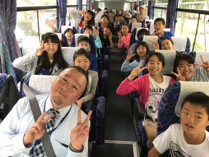 只今、名神高速道路に向かっています。クイズをしているグループや、おしゃべりに花を咲かせているグループなど様々です。