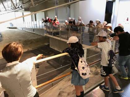 断層を見学しています。大きなひび割れが10km続いていたと聞いて驚きました。