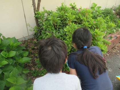 葉っぱをじっくり見ています。葉っぱに虫が付いているのを見て,「生きているのかな?」と友だちで話し合いが始まりました。