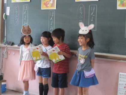 「動物たちは何て言っているのかな?」グループで話し合って,動物たちの言葉も入れて,音読をしました。