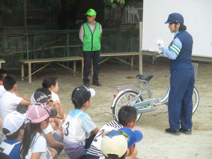 実際に自転車を使って,説明してくれました。「自転車は,道路の左側を歩きます。」