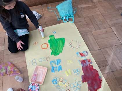 図画工作科の学習で「ぺったんコロコロ」の学習をしました。家から持ってきたトイレットペーパーの芯や洗濯ばさみなどを使って、模造紙にペタペタと押したり、コロコロしたりしました。押した模様がどんな物に見えるか子どもたちに聞くと「ぶどう」「虹」「花」などと押した形を見立ててました。
