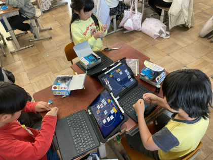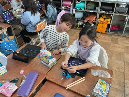 豆電球とかん電池を導線でつなぎ、その間に調べたいものを入れて、電気を通すか調べました。今回の実験では、空き缶やペットボトル、1円玉・10円玉、おはじき、クリップ、はさみ、わりばし、わゴムなどを調べました。