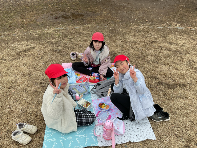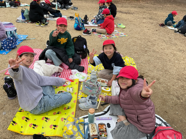子どもたちが一番楽しみにしていたお昼ご飯の時間。みんなでお弁当を食べました。みんなで一緒に食べるお弁当の時間は、自然と笑顔いっぱいになります。お腹も心も満たされました。