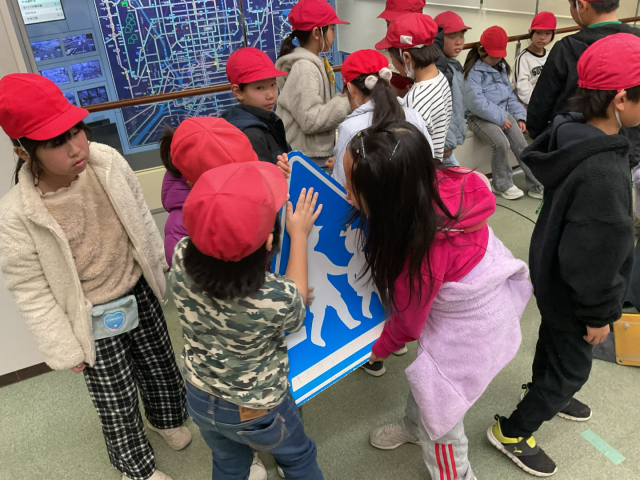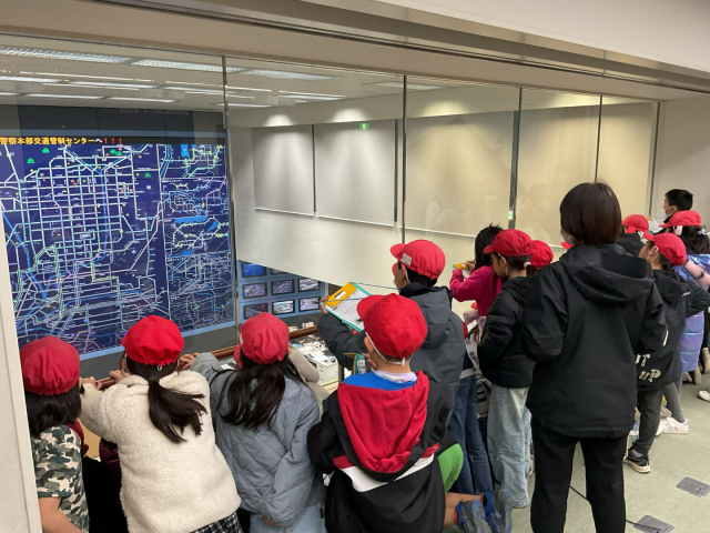 京都府警察広報センターでは、社会科の授業で学習をしてきたことを実施に自分の目で確かめることができました。110番通報がつながる通信指令センターや京都の交通を管理する交通管制センターなどを見学しました。