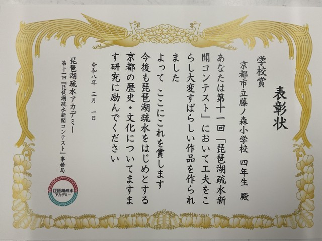 琵琶湖疏水アカデミーの代表の方によると、数年ぶりに学校賞を出されたようです。