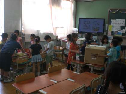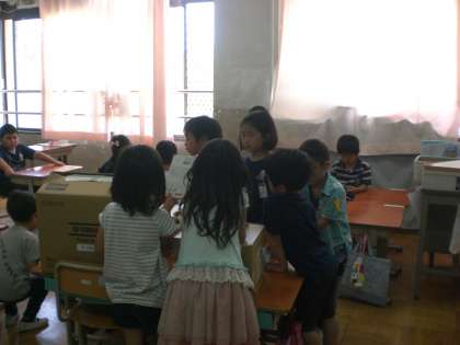 今日は,持ってきた箱などを号車ごとに集めてなかまわけをしました。ころがるかたちやつめるかたちというふうに分けたり,はこのようなかたち・つつのようなかたちに分けたりしました。残念ながら,持ってきた箱などには,ボールのようなかたちはありませんでしたが,教室にある地球儀がその形だということに気が付きました。