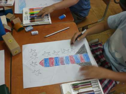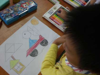 四角形・三角形・円柱などの積み木を使って,かたちを写し取って,絵を描きました。鉛筆を持たない方の手で,しっかりおさえて,形を写しとることを確かめてから始めました。それぞれに,楽しみながら工夫した絵が描けたようです。
