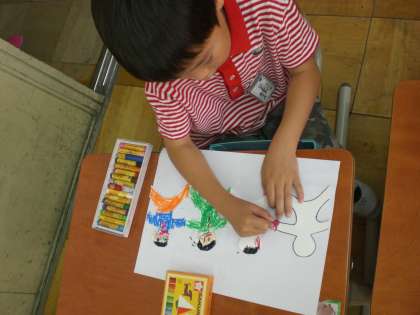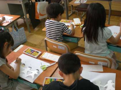 前回の図工で学習したはさみの使いかたを復習してから始めました。「折って重ねて切って、つながるかたち、を作りました。しっかり話を聞いて,形を切れた後は,クレパスでそれぞれに工夫して色を塗りました。時間があった人は,自分でつくりたい形にもチャレンジしました。