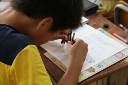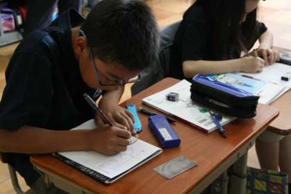 今日の1時間目は算数。昨日は合同な三角形をかく学習を行い,そのことを使って四角形のかき方を考えていきました。頂点を見つけるためにコンパスに定規に分度器にと試行錯誤しながら考えることができました。