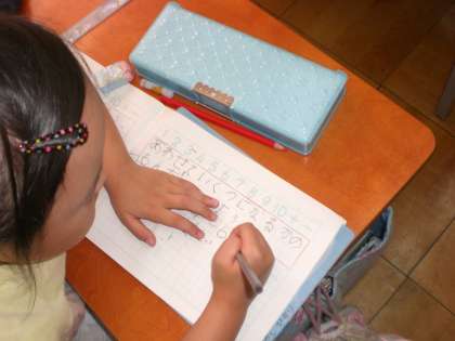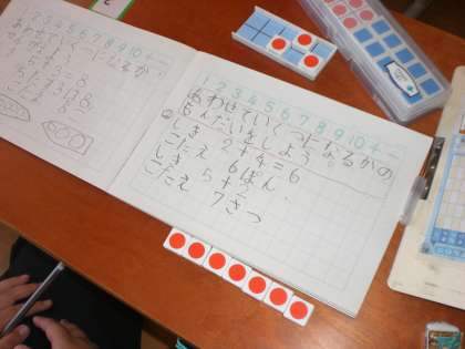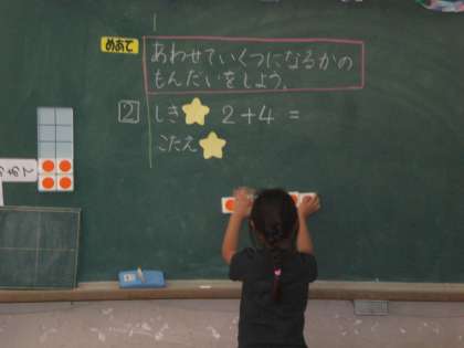 今日は,昨日の学習の続きで,たしざんの式・答えの書き方を復習しながら,問題を解きました。最後に,たしざんで求められる問題の問う言葉には,「あわせて」「みんなで」「ぜんぶで」といろいろあることも確かめました。