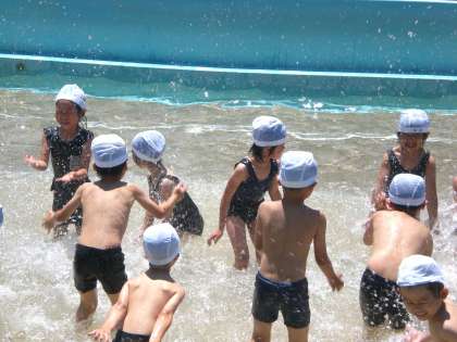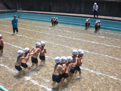 昨日に続いて,今日も低水位でした。今日は,とても良い天気で,水が心地よい様子が見られました。昨日した「かに歩き」「わに歩き」などをした後,最後にシロクマのジェンカをプールで安全にできるように約束ややり方を確認した後,やってみました。
