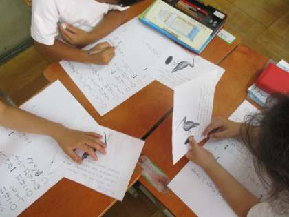 国語科で,鳥のくちばしクイズを作るという学習をしています。「これはなんのくちばしでしょう。」と「これは○○のくちばしです。」という問いと答えの構成に気を付けて,書いています。