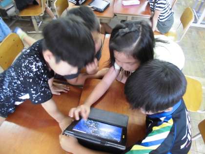 タブレットを使って京都市の土地の様子を調べました。周りを山に囲まれている様子や北から南に鴨川が流れている様子を興味深く見ていました。
