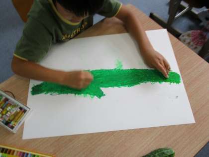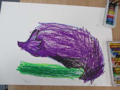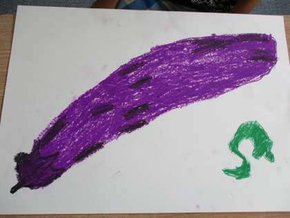 今日収穫したなすび・ししとう・きゅうりを絵に描きました。好きな野菜を好きなポーズで,色を塗る順番・大きさに注意して描きました。