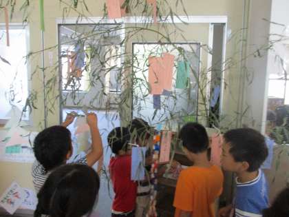 緑の会の方々からいただいた立派な笹の葉を使って,七夕飾りを作りました。「字がきれいに書けるようになりたいです。」「パティシエになりたいです。」など様々なお願い事を書いた子どもたち。みんなのお願い事がかなうといいですね!