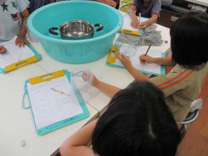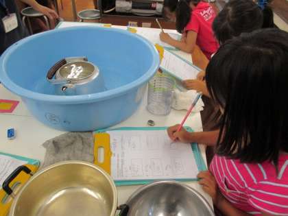 調べる前に予想を書いて、1Lのますをつかってやかんや鍋に水をいれて何杯入るか調べました。