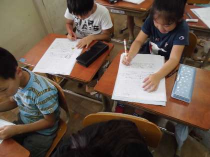 お家の方にも協力していただいて集めてきた自分の身の回りにあるたくさんの記号の中から二つを選び,構成を考えながら,「気になる記号」の報告文を書きました。