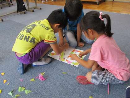 小さい花飾りと大きい花飾り,花びらのある花飾りの3つをつくりました。一枚一枚丁寧にめくり,きれいな花を何個もつくっていました!余ったおはながみを貼って”入口””出口”の看板をつくりました!