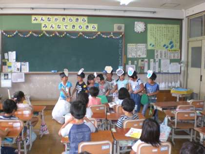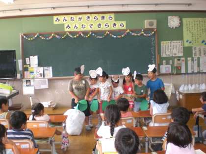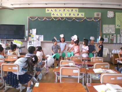 今日の国語の時間は,おおきなかぶの音読発表をしました。前回のおむすぶころりんとは違い,少し劇のように動きをつけてみましたが,7〜8人のグループなので,チームワークよく練習できていたグループは,その成果が見られました。おむすびころりんの時に比べ,驚くほどとても読みが上手になっている子がいて,大変うれしく思いました。
