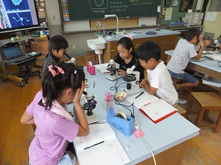 今日は顕微鏡でアサガオの花粉を観察しました。セロテープに花粉をつけ,そのセロテープをスライドガラスに張り付けて観察します。顕微鏡はメダカの学習でも使っているのですぐにピントを合わせることができました。