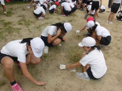 玉入れ集会の後に,草引きをしました。これも運動会に向けての準備です。暑い中でしたが,一生懸命草を抜きました。