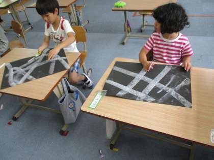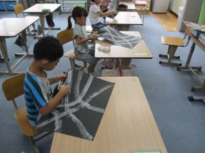 2年生が図工の時間に迷路をつくりました。迷路の絵本からつくってみたい迷路を想像し,4本の線を引いて迷路の道ができました!これからタンポをつかって色を塗っていきます!