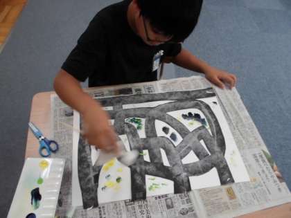 5年生が迷路づくりをしました。とても複雑な迷路の道をつくり,ワープや抜け道など自由に想像していました!5年生はタンポをつかって絵の具で色をつけました!